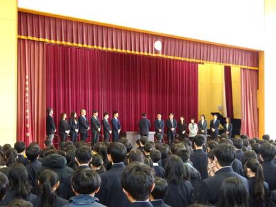 式では、校長先生からの離任者紹介に続き、離任される先生方お一人お一人からご挨拶をいただきました。本校での思い出や、生徒たちへの励ましの言葉、そしてこれからの人生に向けた温かいメッセージなど、胸を打つお話ばかりでした。