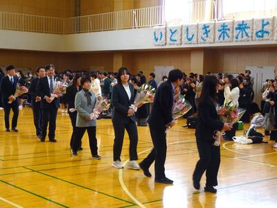 その後、生徒会長から、先生方との思い出や感謝の気持ちを込めた「お礼の言葉」が述べられ、生徒会役員より感謝 の印として花束が贈呈されました。