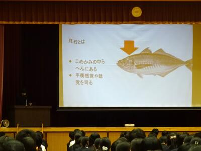一人目の講話のテーマは「三ツ星耳石ハンター認定までの歩み」です。聴覚や平衡感覚を司る耳石について、実際に収集した様々な魚の耳石をプロジェクターで投影して説明してくれました。講話の最後には、「サケ」の耳石と「ウマヅラハギ」の耳石を当てる2択のクイズ問題も出題されました。質疑応答の時間には、「なぜ耳石を研究しようと思ったのか?」「シシャモの頭を食べていますが、耳石は食べても大丈夫ですか?」「一番おいしかった魚は何ですか?」といった多くの質問があり、一つ一つに丁寧に答えていました。