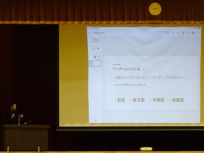二人目の講話のテーマは「LAへの短期留学で学んだこと」で、今年の夏にTOMODACHI Toshizo Watanabe Leadership Programに参加した生徒の報告です。この生徒はアメリカでdiversity/cultural exchange/expand your horizon/community について学びました。そして、先頭に立って引っ張っていくだけがリーダーシップではなく、前型/後ろ型/共感型/俯瞰型の4つに分類できると考えるに至ったと話をしてくれました。その後の質疑応答では、英語での質問に英語で答える場面もありました。