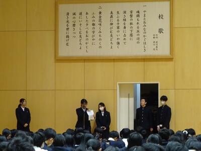 最初に音楽部による指揮と伴奏で校歌を斉唱しました。