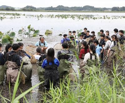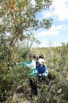 この活動の一環として高校1年次生対象の北上川フィールドワークを9月25日(木)、26日(金)の2日間で実施しました。岩手県と宮城県にまたがる北上川に関して、その歴史や周辺の地形、自然環境、近隣の自治体が抱える様々な課題などについて、実際に現地に赴いて学びます。1日目は、7つのHR(ホームルーム)が3つに分かれ(1)東松島市の野蒜海岸、洲崎湿地(2)伊豆沼サンクチュアリセンター(3)北上川ダム統合管理事務所(四十四田ダム)、旧松尾鉱山新中和処理施設をそれぞれ訪れ、研修を行いました。2日目は八幡平中腹にある旧松尾鉱山跡地で育樹活動(補植・追肥)を行いました。この鉱山はかつて東洋一の硫黄産出量を誇った鉱山でしたが、硫化鉄鉱と水(雨水や地下水)、酸素が反応して発生する強酸性水が、閉山となった今でも流出していて大きな問題となっています。そのため,現在大規模な中和施設が設置されていますが、その維持費は年間5億円にも及んでいます。鉱山にはまだまだ大量の硫化鉄鉱が眠っていますが、それと反応する水が地下に流れ込まないよう山の保水力を高めるための緑化活動がこの育樹です。10年以上継続しているため、かつての生徒たちが植えた樹木も大きく育っています。当日は天候に恵まれ、近くに岩手山を望みながら、生徒は黙々と作業を行っていました。慣れない作業ではありましたが、全員が充実した達成感あふれる表情で終えることができました。環境保全の規模としては小さいかもしれませんが、継続していくことでいつか環境が蘇ることを期待し、これからもこの活動を続けていきたいと思っています。